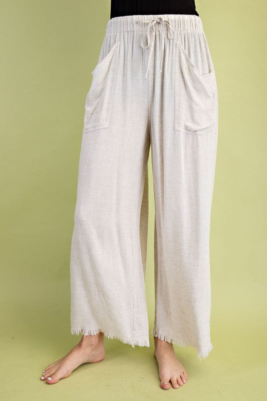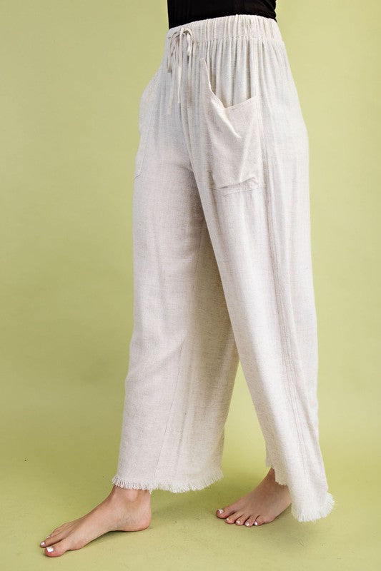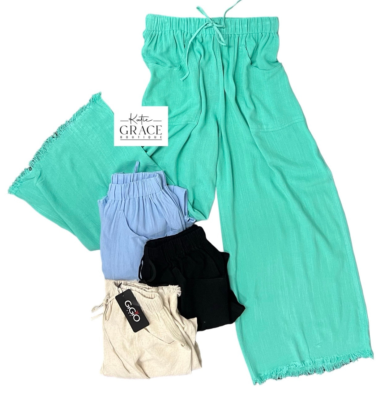 Elastic waist, lightweight soft Cotton pants. Pockets with frayed edges. Available in S-L. $34