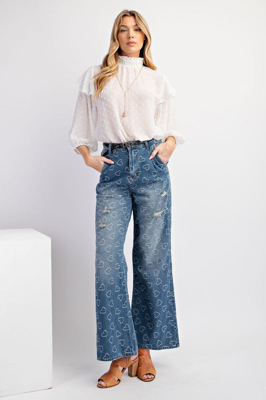Pleated waist jeans with embroidered hearts and distressed details. Available in S-L. $32