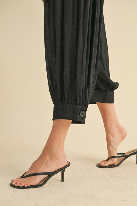Elastic waist pants. Buttons at the ankle. Semi sheer. Available in S-L. $34