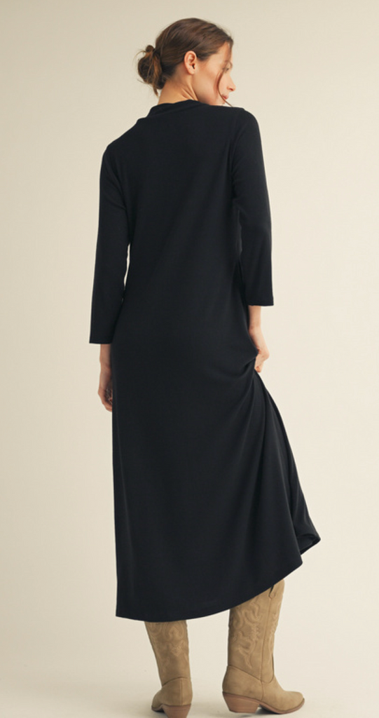 Long sleeves mock neck knit dress with side pockets. Soft sweater knit. S-L. $45