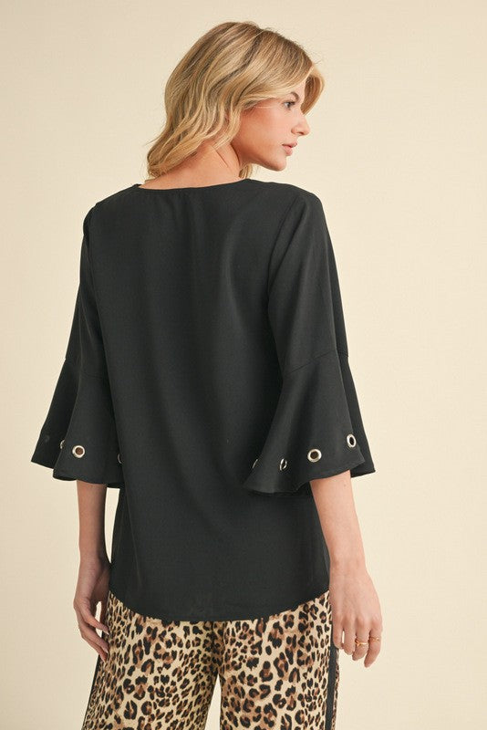 3/4 sleeves with grommet detail on the sleeves. Available in S-L. $39